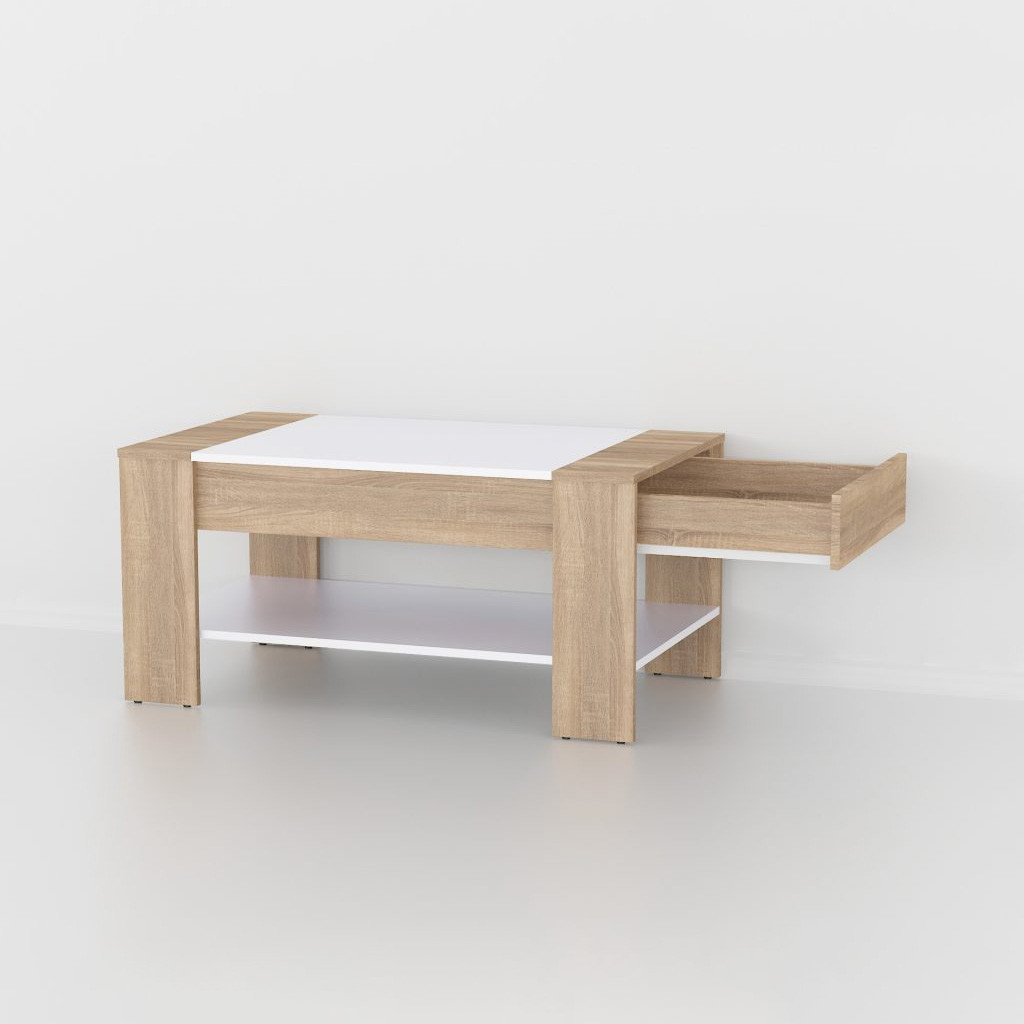 Цей кавовий столик - ідеальне рішення для вашої вітальні, забезпечуючи не тільки стильний акцент, а й практичний простір для зберігання. Виготовлений із міцного та надійного ЛДСП, цей прямокутний столик гармонійно впишеться у будь-який інтер'єр, надаючи йому сучасного шарму. Особливістю цього столика є наявність зручного ящика для зберігання речей, що робить його не лише стильним елементом декору, а й функціональною частиною вашого простору. Завдяки цій скриньці у вас завжди буде під рукою все необхідне – від пульта дистанційного керування до книг та журналів. Цей кавовий столик обіцяє стати зручним та практичним аксесуаром для вашої вітальні, додаючи до неї функціональність та стиль. Його проста та елегантна конструкція робить його ідеальним вибором для тих, хто цінує комфорт та практичність у своєму будинку.